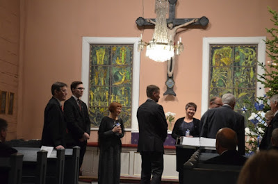 Igår kväll körde jag norrut till grannkommunen. Där i kyrkan lät jag mej förföras av smäktande toner från en hel skara kostymklädda herrar.